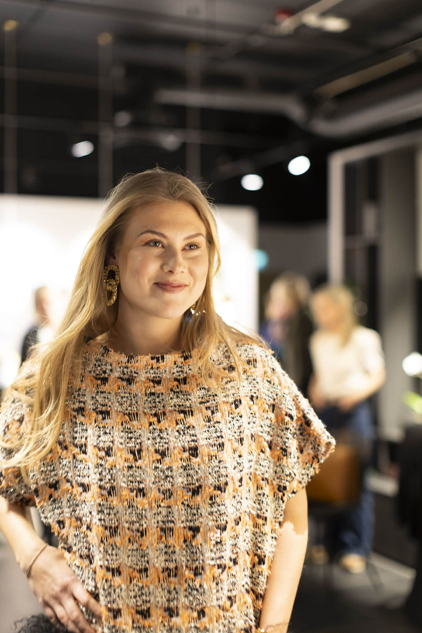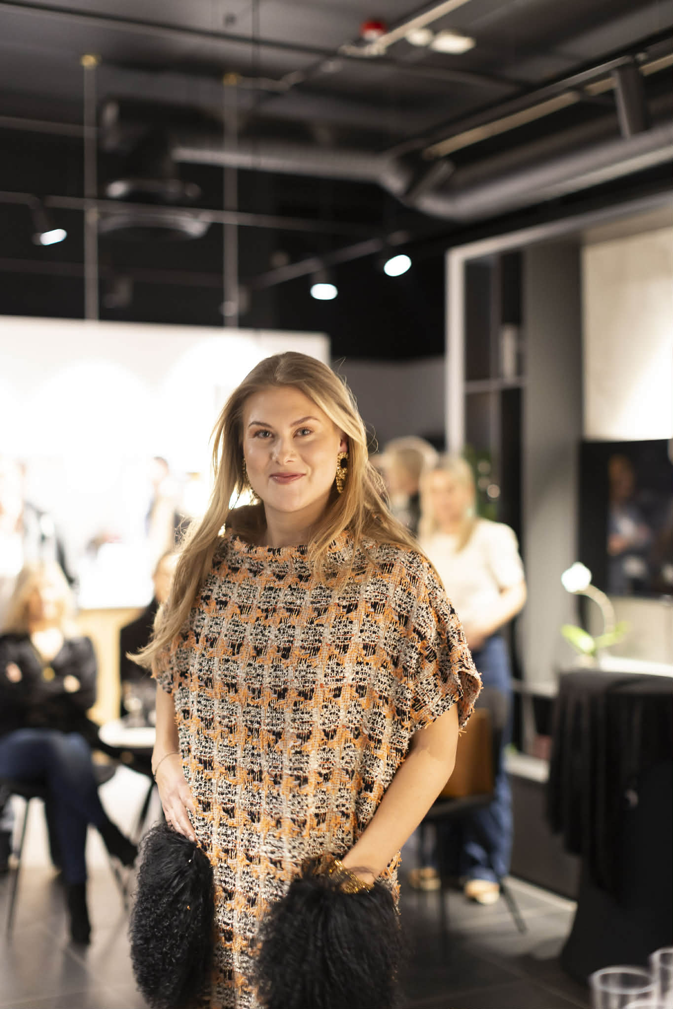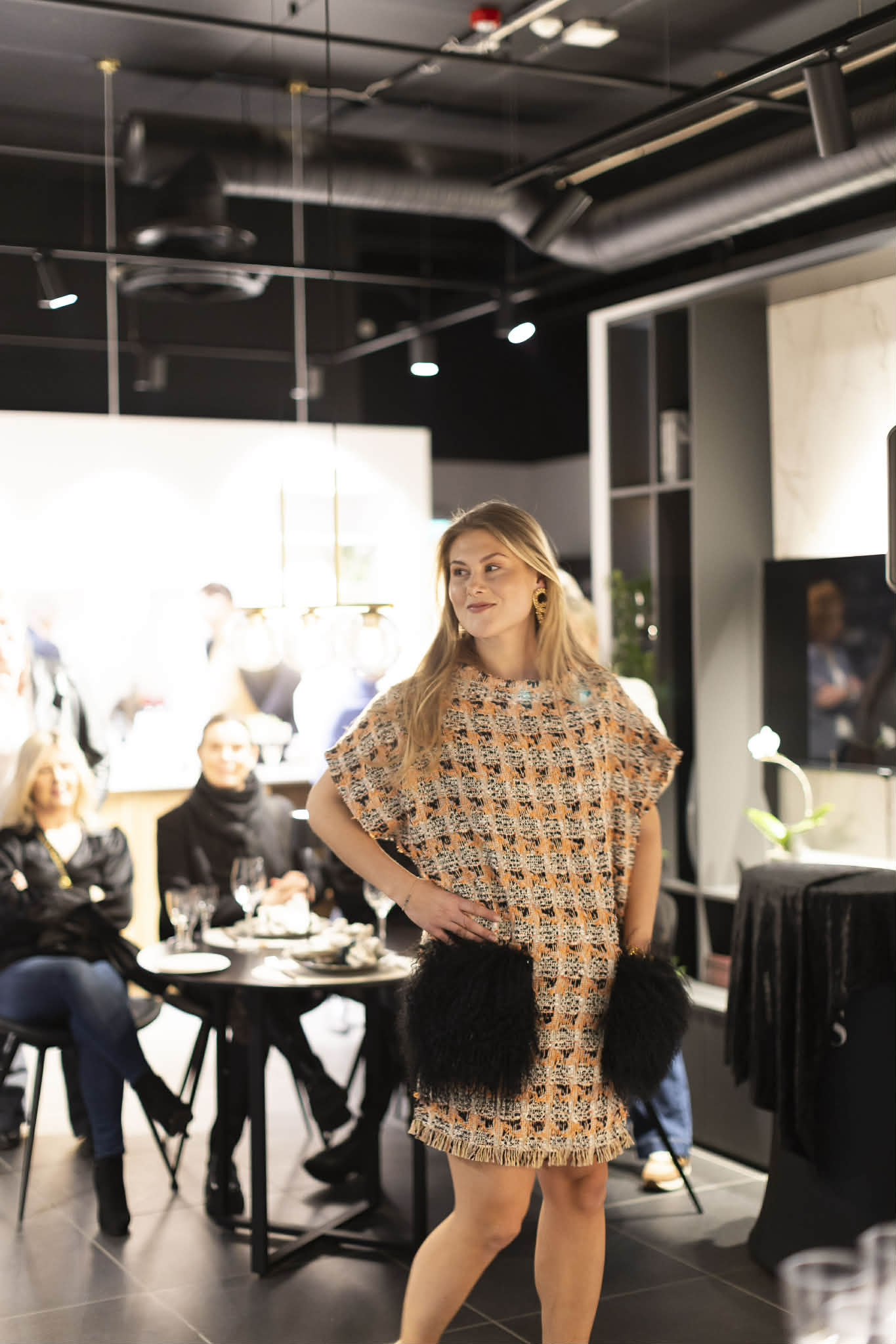 Kimono kjole i behagelig snitt og kjempekul med høye støvler. Stoffet er gull og sølv tweed med oppsiktsvekkende stoff. Påsydde lommer i tibetlampels. Kjolen kler også høyhalset pologenser og tykke strømper.
